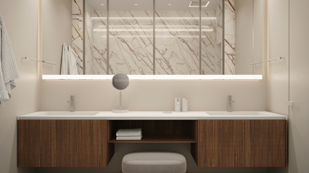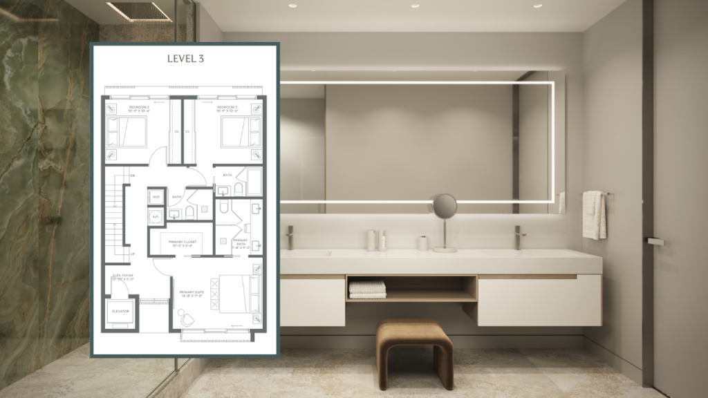 Bathrooms are designed to feel like private wellness spaces with elegant stone finishes, premium fixtures, and Toto toilets in the primary bathroom. These thoughtful details elevate everyday routines while maintaining a clean and modern aesthetic.