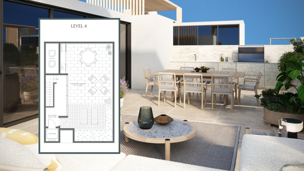 One of the standout features of the Villa A1 layout is the private rooftop terrace, an ideal space for enjoying the Miami lifestyle. Whether hosting friends, relaxing in the sun, or enjoying evening breezes, the rooftop creates a seamless extension of the home’s indoor living spaces.